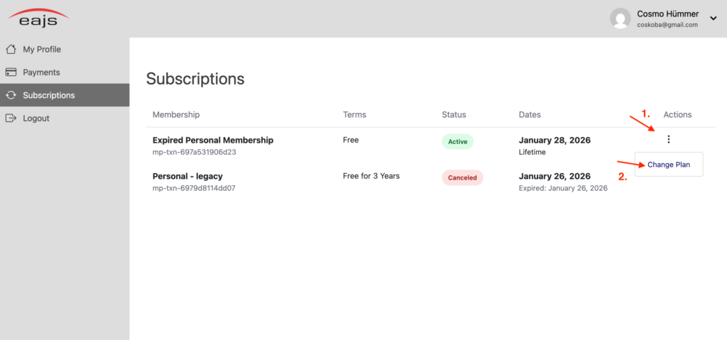 Once logged in, please go to Subscriptions. Under the actions menu please first press the ☰ icon and then on Change Plan. There, you can select the tier you wish to resubscribe under.