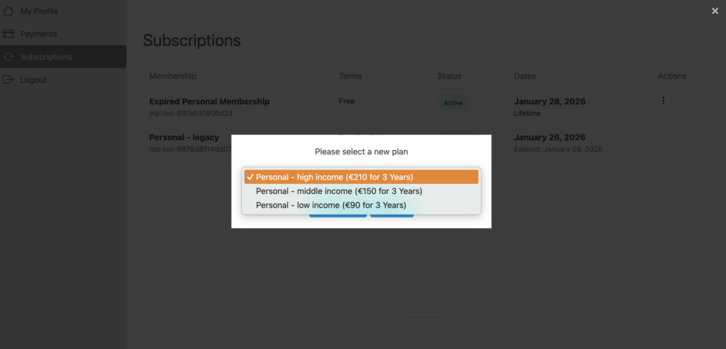 Please note that you are only able to resubscribe through the tier you were last active under. If you wish to for instance switch from a Student to a Personal membership, please send us an e-mail and let us know.